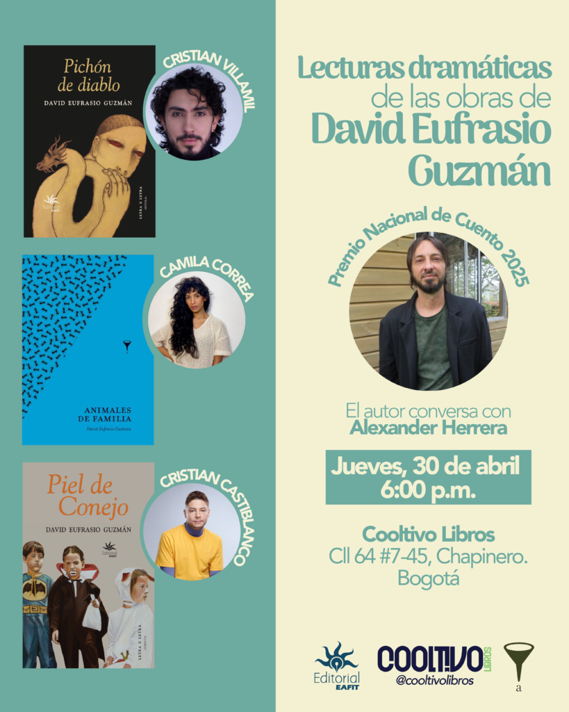Lectura dramática de la obra del reciente Premio Nacional de Cuento, David Eufrasio Guzmán. Tres voces en escena dan vida a sus textos, seguido de una conversación del autor con Alexander Herrera. Entrada libre.