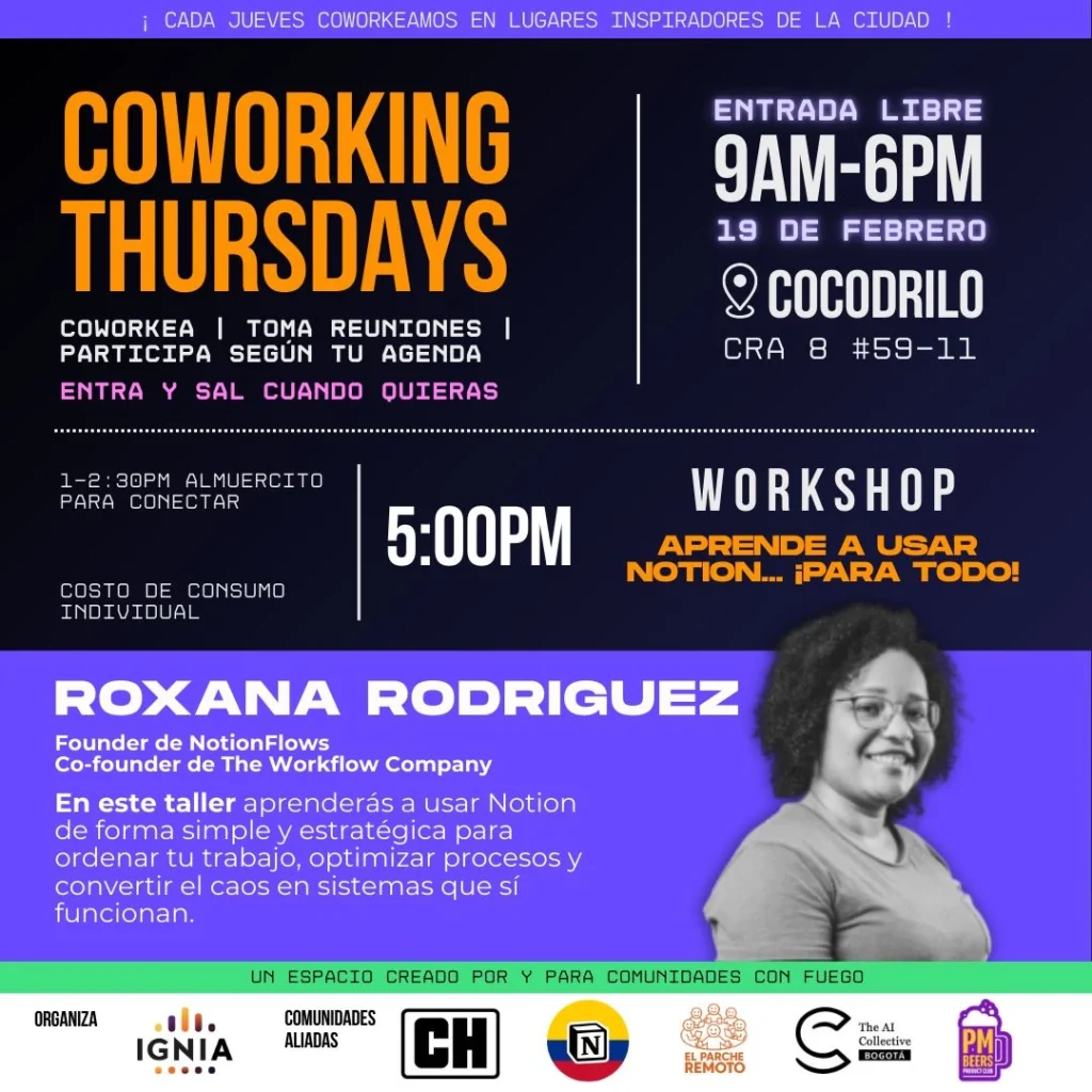Venga a coworkear y asista al workshop de Roxana Rodríguez, fundadora de la comunidad de Notion en Colombia